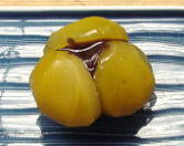 虎豆鹿の子 380円さいころ状の羊羹を芯にこしあんを丸め、蜜漬けの虎豆をまとわせました。おしまいに錦玉液を一刷けぬり、艶良く仕上げたものです。虎豆独自の風味がたまりません。アレルギーフリー。 【お日持ち:冷蔵保管の上翌々日中】 |